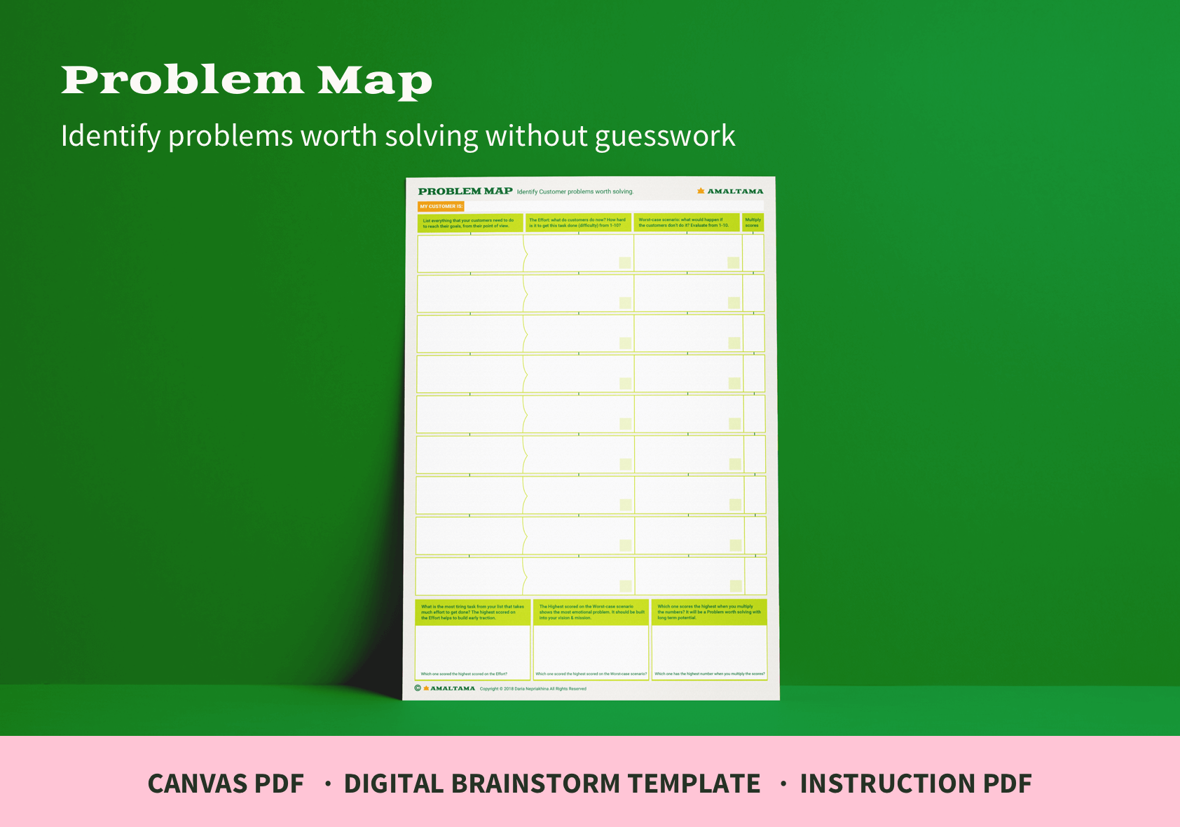 Identify customers problems worth solving without guesswork:✓ Printable Problem Map in PDF ✓ Problem Map adjusted for comfortable digital brainstorms using online tools such as Miro ✓ Instruction PDF, that can be used as slides during your brainstorm session or workshop. ✓ 2 case studies added to Instruction PDF